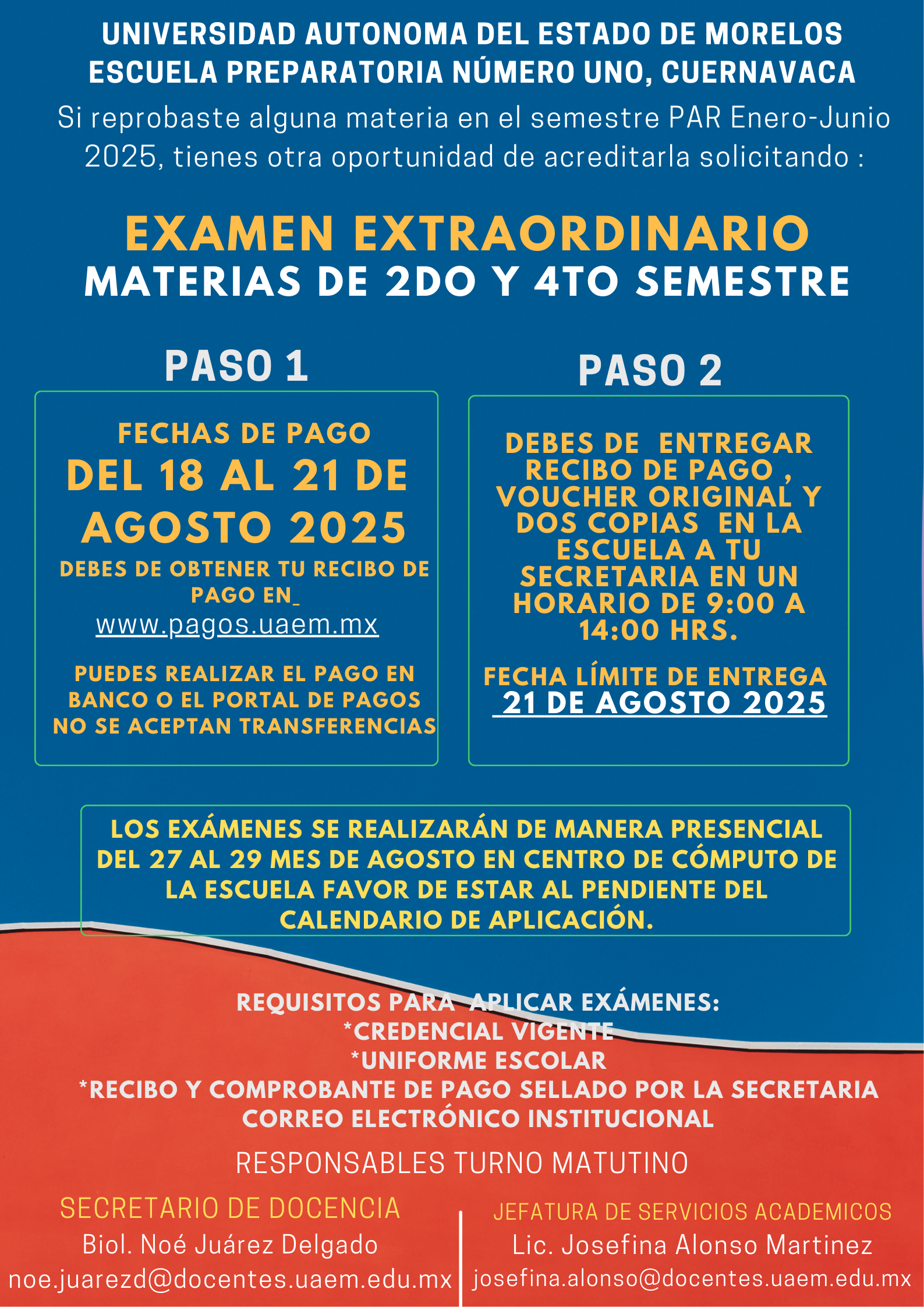 Les compartimos la información para la solicitud, pago y entrega de comprobantes de los exámenes extraordinarios para materias de 2do y 4to semestre. Favor de seguir las indicaciones de las fechas y realizar el proceso en tiempo y forma. Comparte esto: Haz clic para compartir en X (Se abre en una ventana nueva) X Haz clic para compartir en Facebook (Se abre en una ventana nueva) Facebook Me gusta Cargando... Relacionado