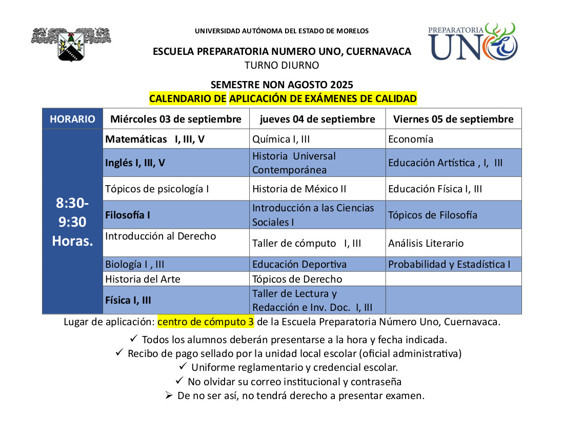 Les compartimos el calendario de aplicación de los exámenes de calidad.Nota: Estos exámenes no aplican para primer año. Comparte esto: Haz clic para compartir en X (Se abre en una ventana nueva) X Haz clic para compartir en Facebook (Se abre en una ventana nueva) Facebook Me gusta Cargando... Relacionado