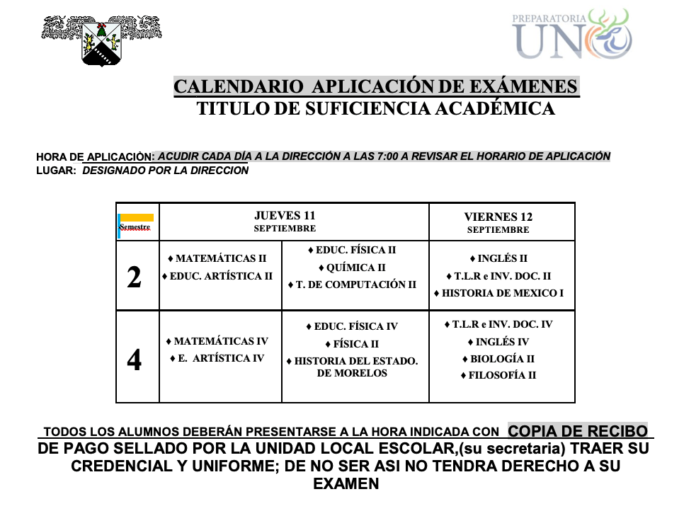 Les compartimos el calendario, les recordamos que es muy importante que acudan a la dirección de la escuela los dos días de aplicación para confirmar los horarios y los salones donde van a aplicar su examen.