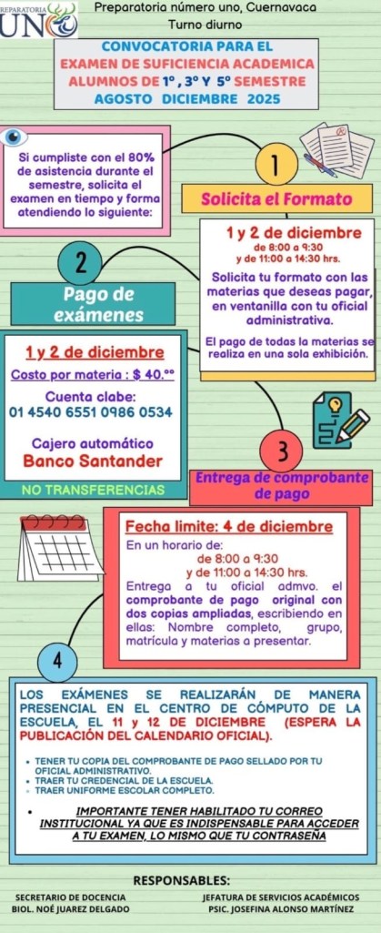 Para tener derecho a presentar el Examen de Suficiencia Académica, deberán contar con al menos el 80% de asistencia. Asimismo, es indispensable que tengan habilitado su correo institucional (@prepauno.uaem.edu.mx) .