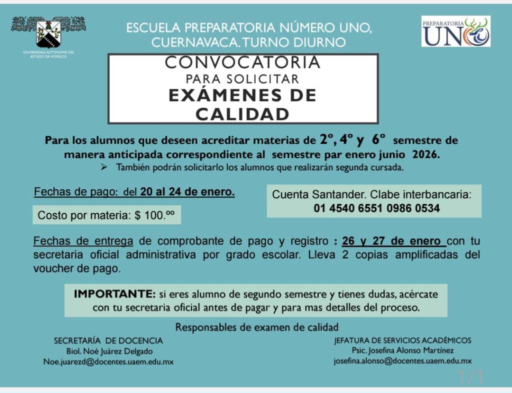 NOTA: Si reprobaste alguna materia en el semestre agosto-diciembre 2025 y/o el examen de suficiencia académica, el examen de calidad no es tu siguiente oportunidad; es un proceso diferente. En este caso la siguiente oportunidad sería el examen EXTRAORDINARIO.Les compartimos la información sobre el proceso de solicitud y pago de los exámenes de Calidad.