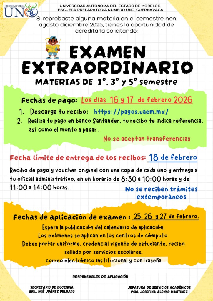 Les compartimos la información del examen extraordinario, el cual es la siguiente oportunidad si reprobaste una materia del semestre anterior y no aprobaste en el examen de suficiencia. Comparte esto: Compartir en X (Se abre en una ventana nueva) X Comparte en Facebook (Se abre en una ventana nueva) Facebook Me gusta Cargando... Relacionado